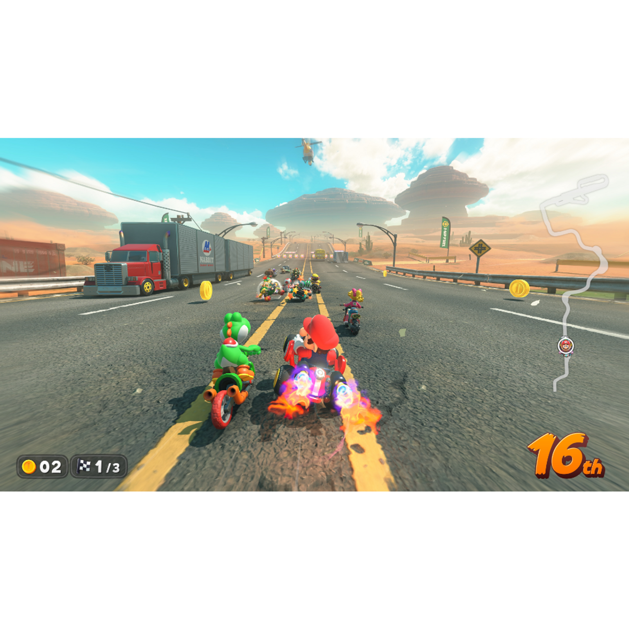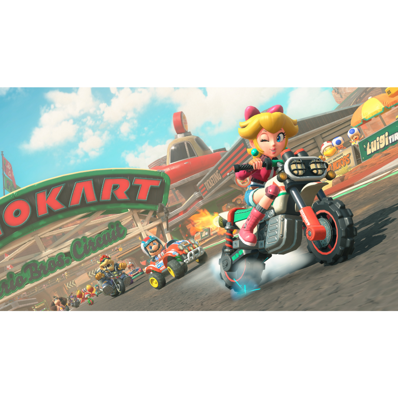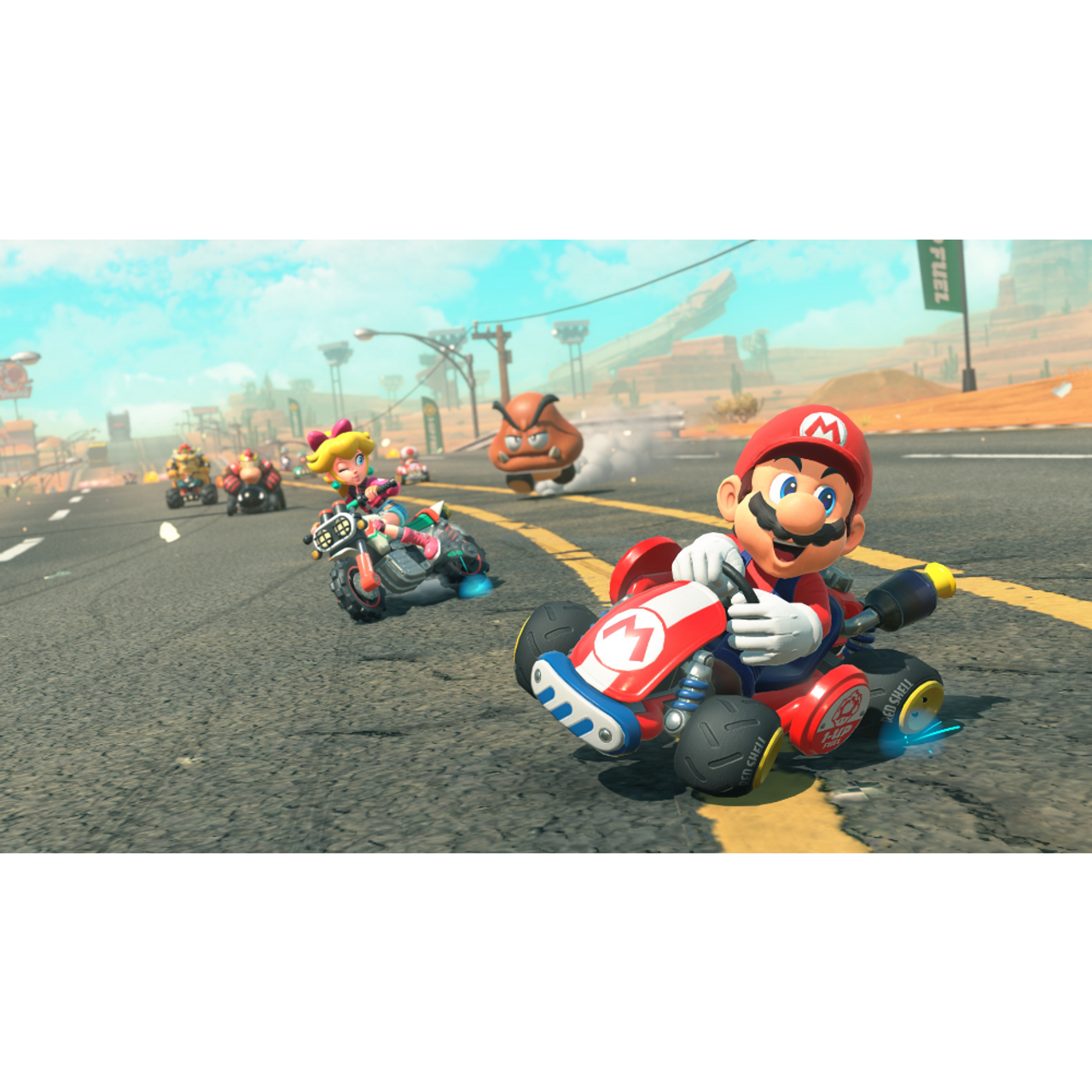 The whole world is your racetrack in this massive evolution of the Mario Kart™ series! The courses you race on are all connected in a seamless world. Drive the paths between them to traverse mountains, forests, cities, and more. Take in the sprawling vistas as you explore at your own pace in Free Roam—or watch how a sudden shift in the weather can mix up a dead heat in a tense Grand Prix.